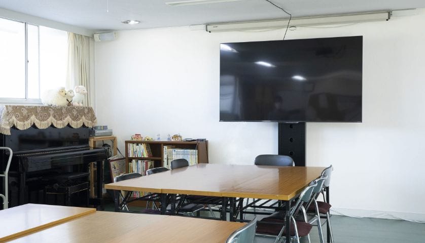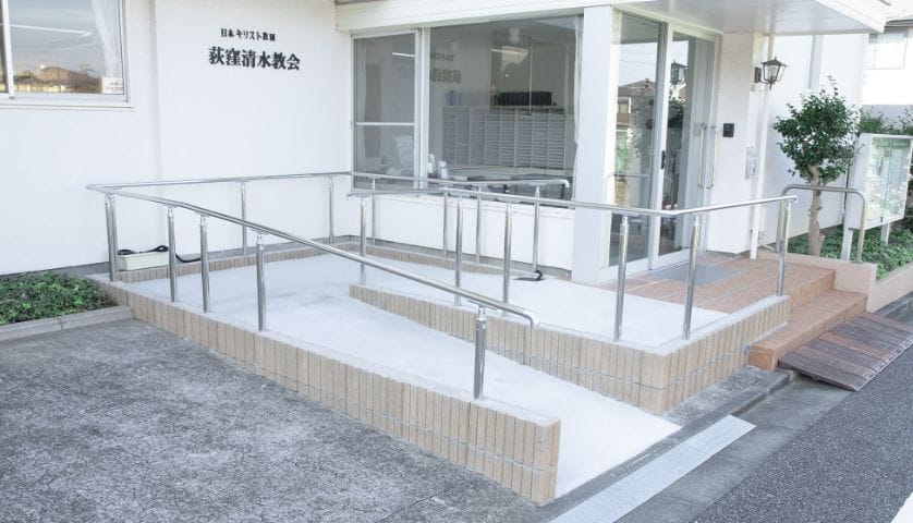 教会玄関にスロープがありますので不自由なく入堂できます。バリアフリーのトイレもあります。二階礼拝堂へのエレベーターは未設置ですが、一階の大型テレビに礼拝堂を映しますので共に礼拝に参加できます。
